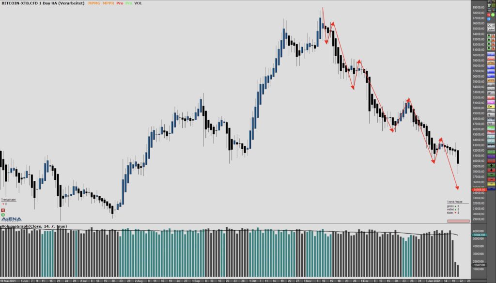 Die Crypto Werte korrigieren derzeit heftig im teilweisen zweistelligen Preis. Beim Bitcoin haben wir die psychologische Marke von 40.000 US-Dollar unterboten und somit ist der Weg offen. Anhand der Preis Analyse weiter unten können wir sehen, dass sich der Down-Trend einfach nur weiter fortgesetzt hat und somit sehen wir wieder einmal, dass eine Trendfortsetzung wahrscheinlicher ist als ein Trendbruch.