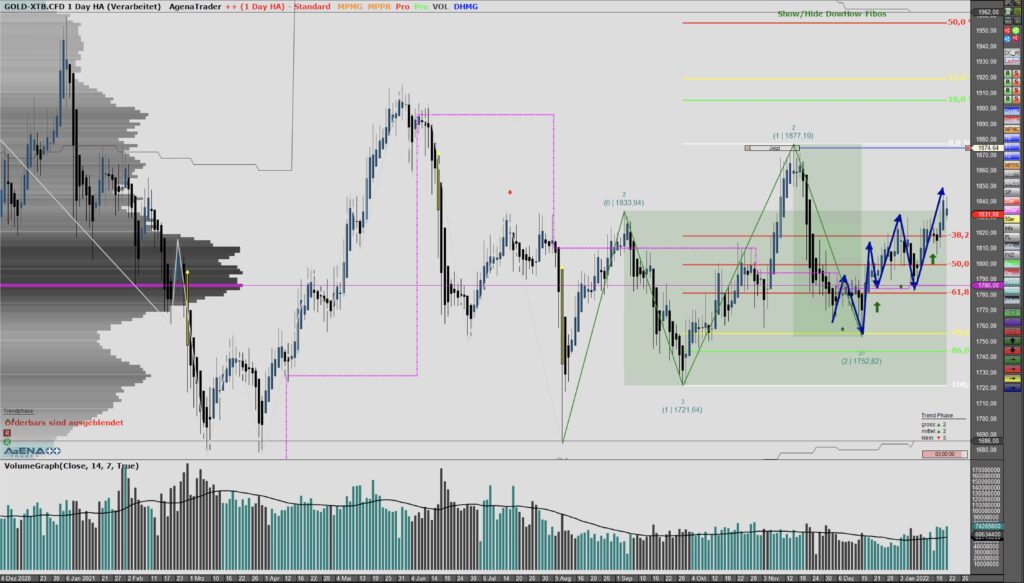 Wir haben einen Up-Trend, der etwas unsauber aussieht, aber dennoch seine Berechtigung hat. Derzeitig befinden wir uns in der Bewegung und deshalb bleibt für uns bei diesem Preis nichts zu tun.