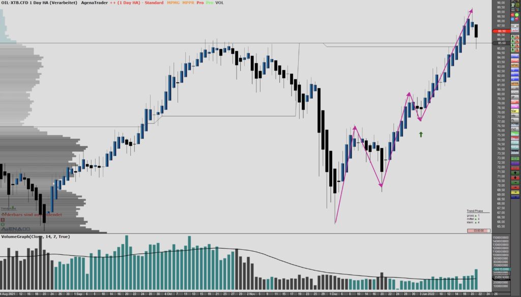 Bei diesem Preis können wir was lernen und deswegen habe ich mir diesen Wert auch rausgesucht. Der Up-Trend (grün) wurde oben mit dem Schub rausgenommen.Der ganz große Down-Trend war aber immer noch aktiv (rot).Aktuell müssen wir auf eine Korrektur des Preises warten, um nach Regelwerk einsteigen zu können.