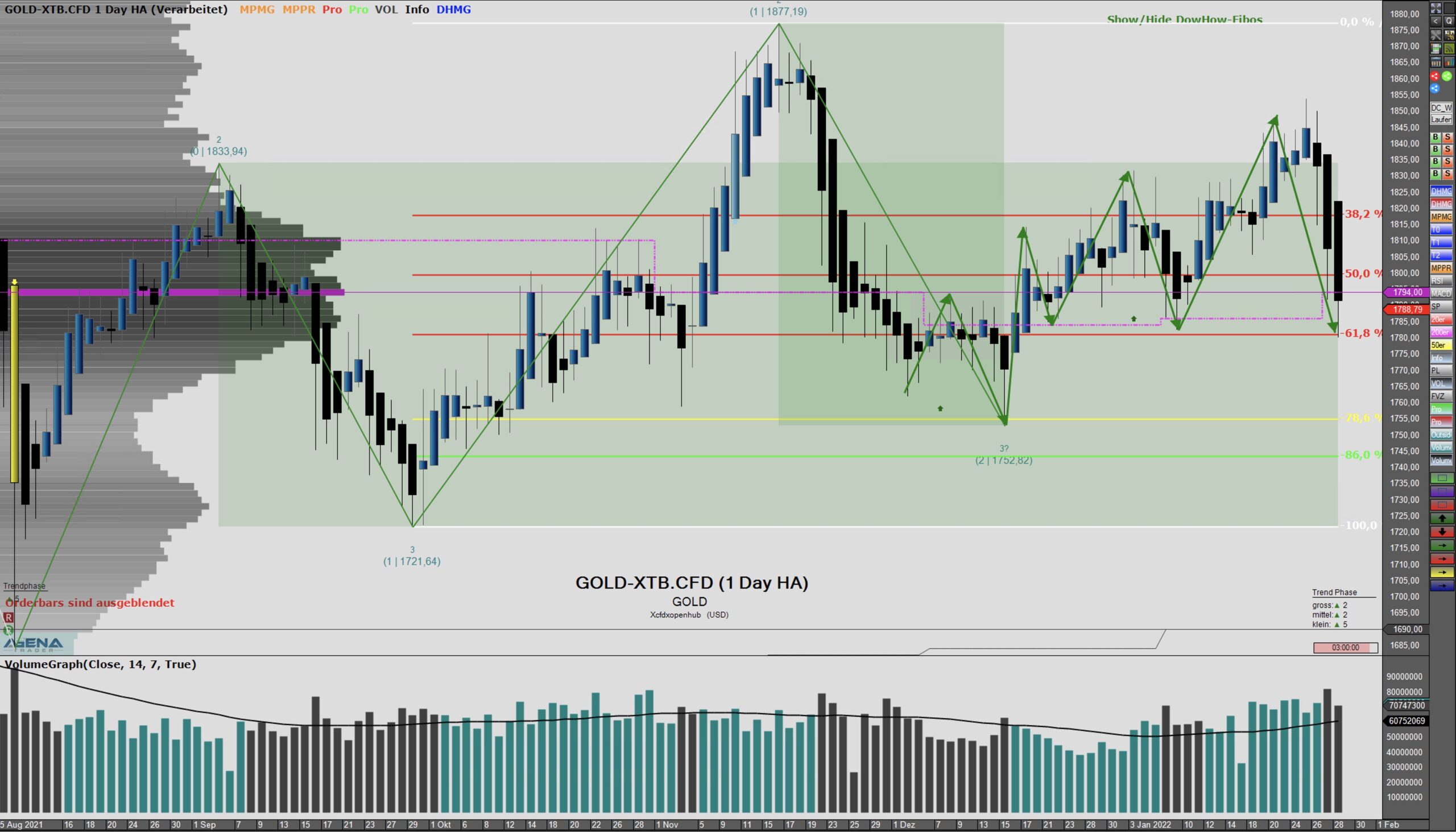 Der große Up-Trend ist immer noch aktiv und seine Korrektur hat sich ausgedehnt. Derweilen hat sich ein kleiner Up-Trend im großen Trend herausgebildet und auch hier wäre schon ein Einstieg nach Regelwerk möglich gewesen. Zum jetzigen Zeitpunkt haben der Preis zu 100% korrigiert und wir warten auf eine Ausgleichskerze.