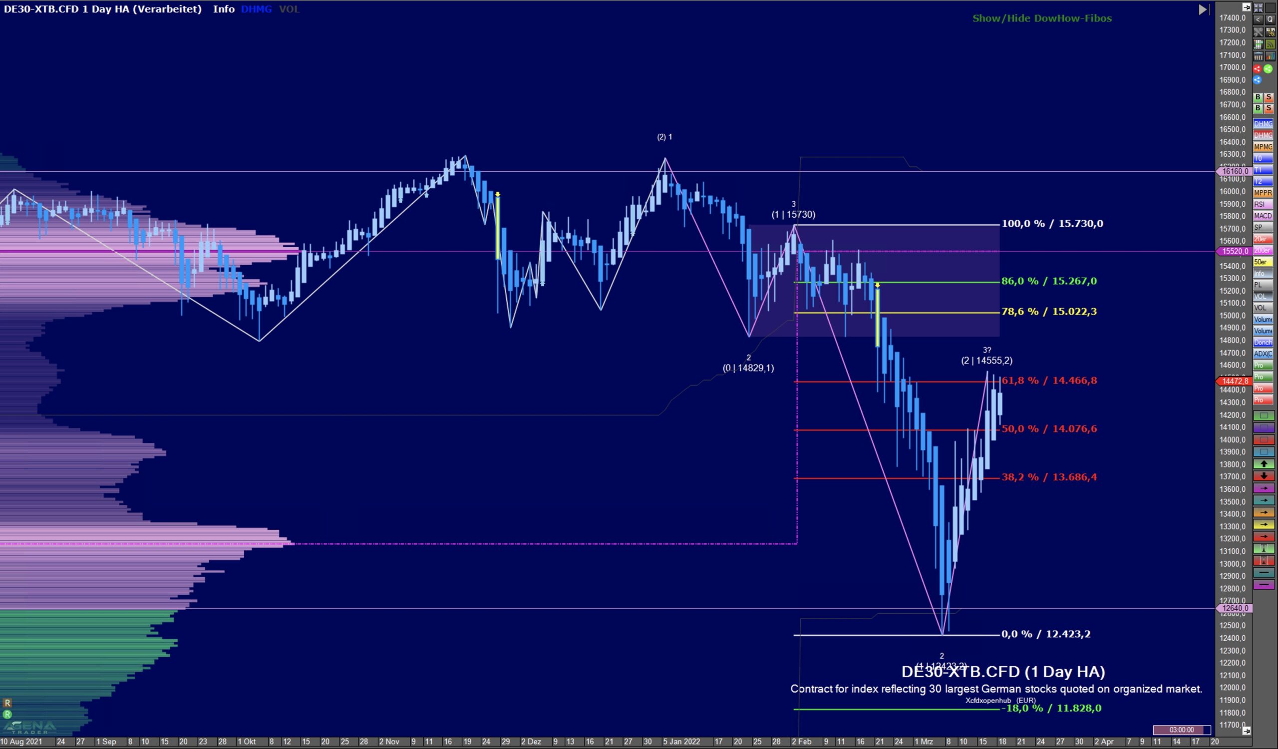 Wir können auf dem Chartbild wunderbar die Trendfolge erkennen, gepaart mit dem abarbeiten des alten Point of Control. Es muss derzeit abgewartet werden, bis sich ein erneutes Einstiegssignal bietet, die wenigen von Ihnen, die bei etwa 15200 Short gegangen sind, Teilverkauf am alten POC und die Restposition laufenlassen. Wir warten derzeit auf ein Umkehrsignal des Marktes!